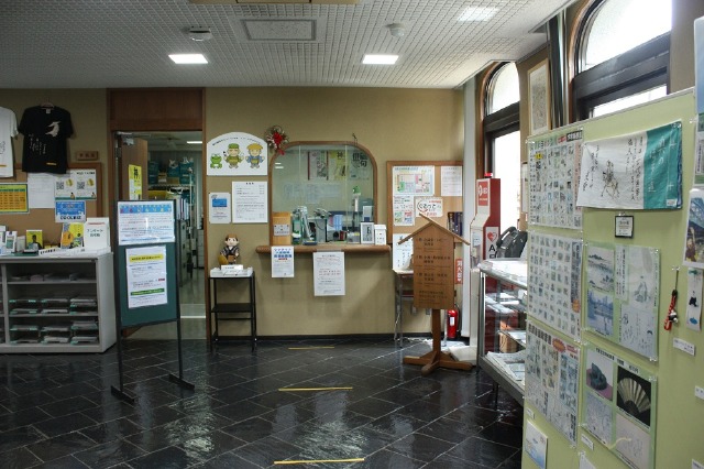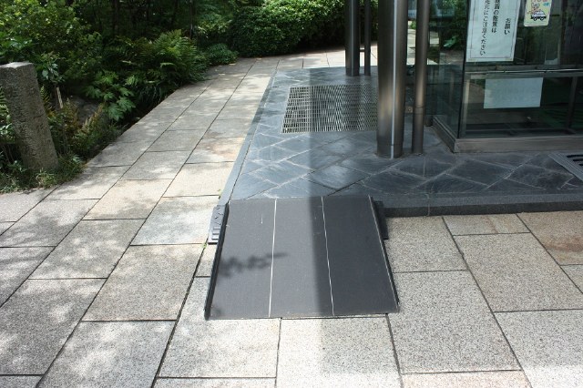館入口の段差解消用に移動式スロープを用意しています。正面玄関を入って右手に受付があります。