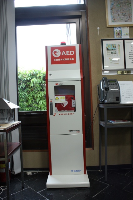 AEDは1階ロビーにあります。