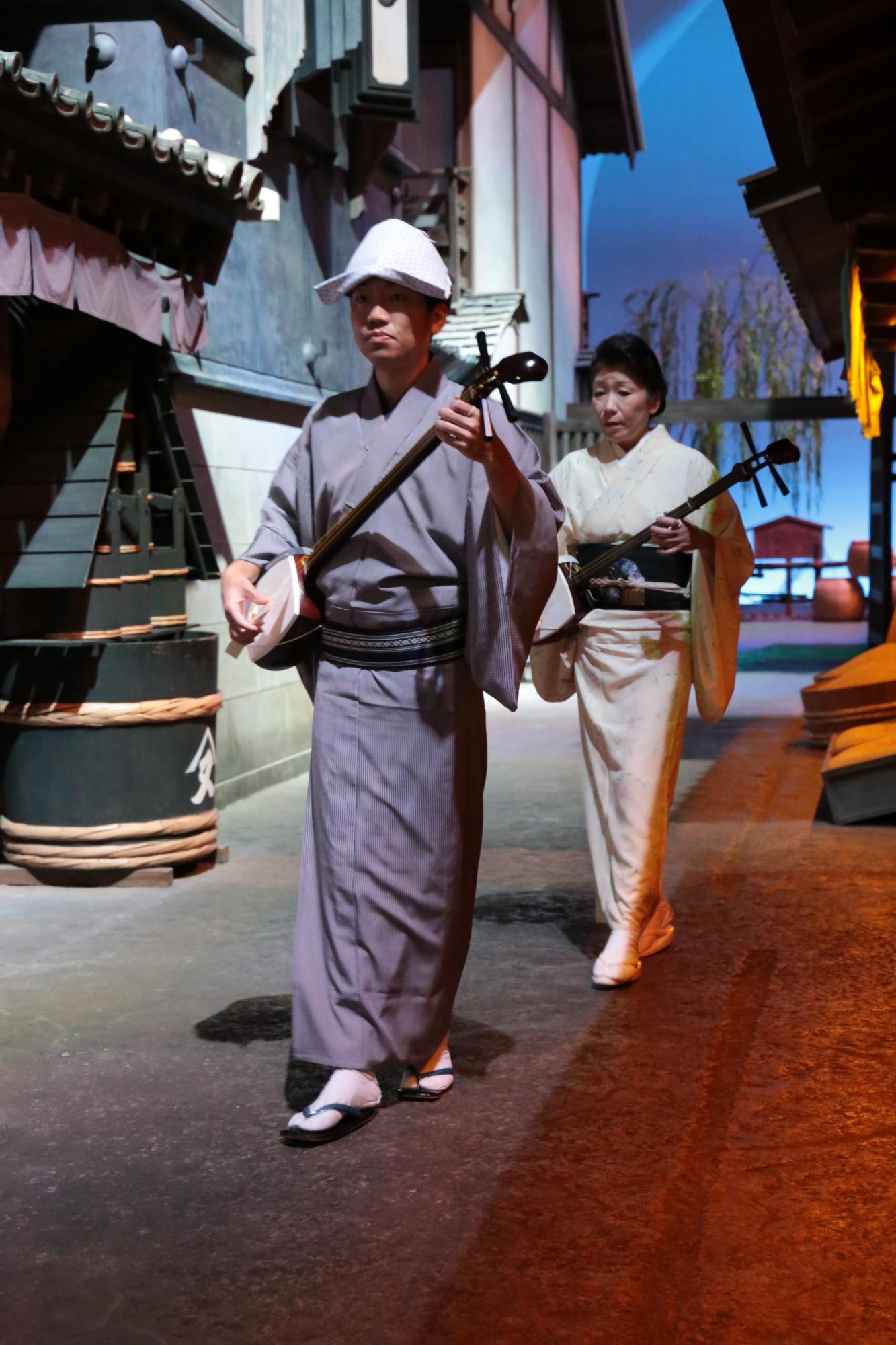 深川江戸資料館、夕暮れの町並みの中、三味線の音が聞こえてきたら「新内流し」のはじまりです。
