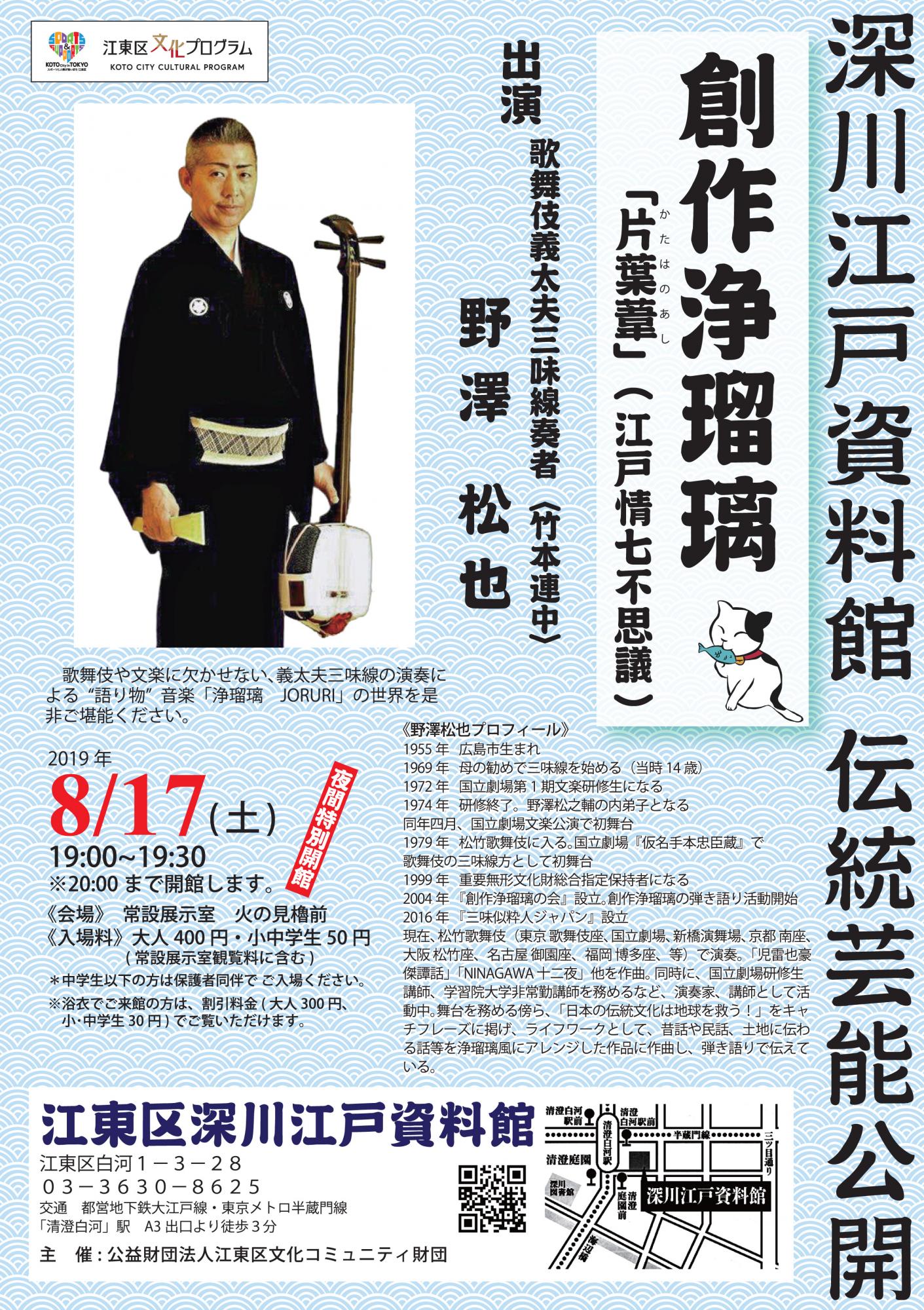 | 出演 | 野澤 松也(歌舞伎義太夫三味線奏者〈竹本連中〉) 《プロフィール》 1955年 広島市生まれ 現在、松竹歌舞伎(東京 歌舞伎座、国立劇場、新橋演舞場、京都 南座、大阪 松竹座、名古屋 御園座、福岡 博多座、等)で演奏。 「児雷也豪傑譚話」「NINAGAWA 十二夜」他を作曲。 同時に、国立劇場研修生講師、学習院大学非常勤講師を務めるなど、演奏家、講師として活動中。 舞台を務める傍ら、「日本の伝統文化は地球を救う!」をキャチフレーズに掲げ、ライフワークとして、昔話や民話、土地に伝わる話等を浄瑠璃風にアレンジした作品に作曲し、弾き語りで伝えている。 |