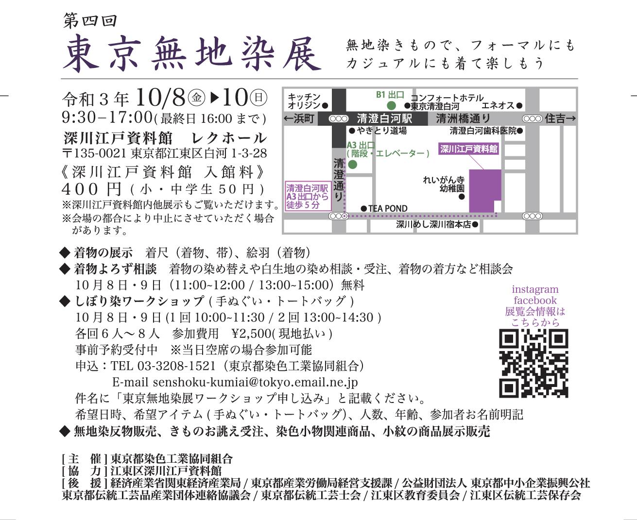 | しぼり染ワークショップ(手ぬぐい・トートバック) | 10月8日(金)・9日(土) ①10:00~11:30 ②13:00~14:30 【定員】各回6~8名 【料金】2,500円(現地払い) 事前予約受付中 ※当日空席の場合参加可能 【申込】:TEL03-3208-1521(東京都染色工業協同組合) ※コロナ感染予防対策により中止させていただく場合があります。 |