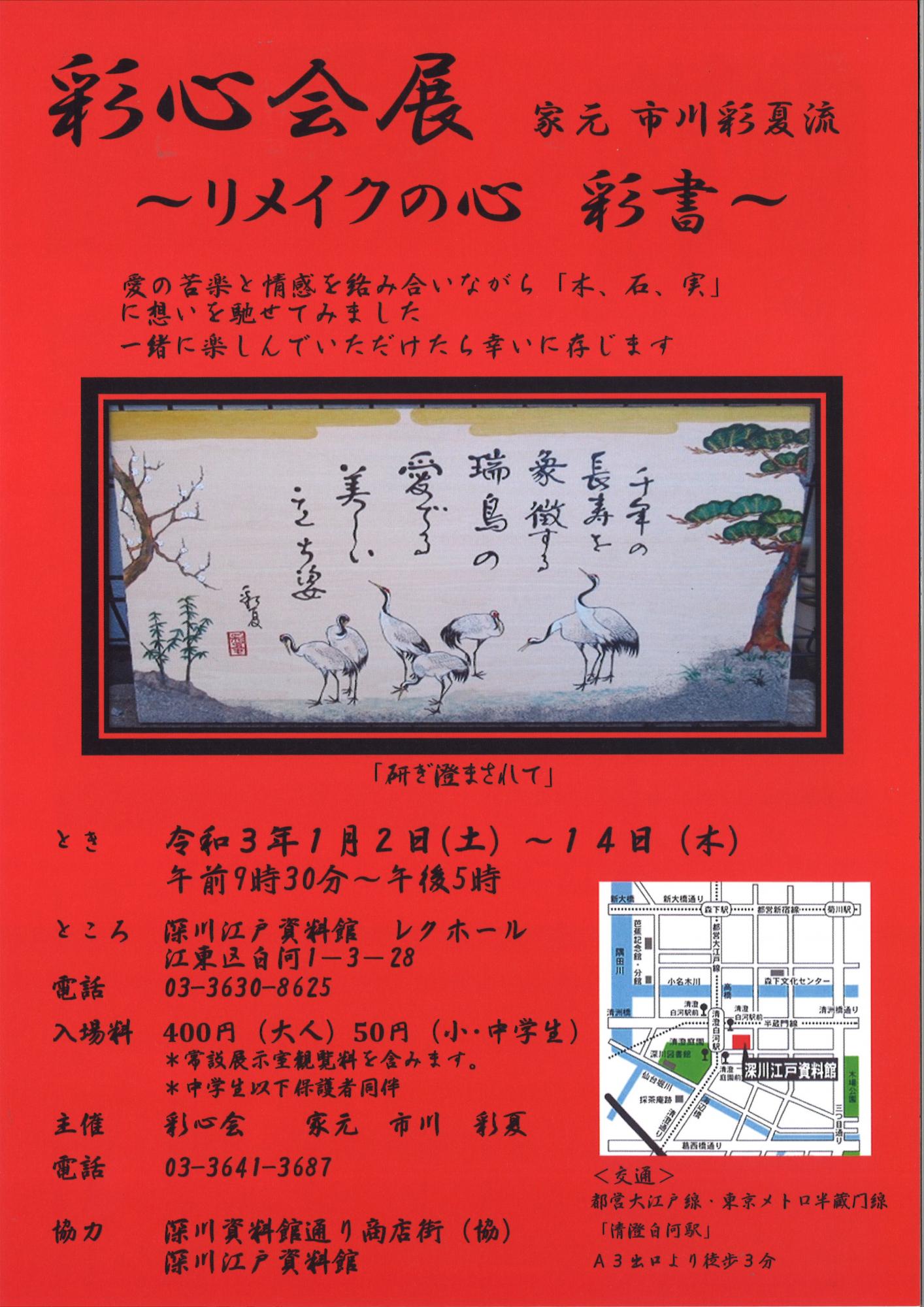 財団ホーム深川江戸資料館イベント・講座情報「彩心会展 リメイクの心 彩書 家元 市川彩夏流」