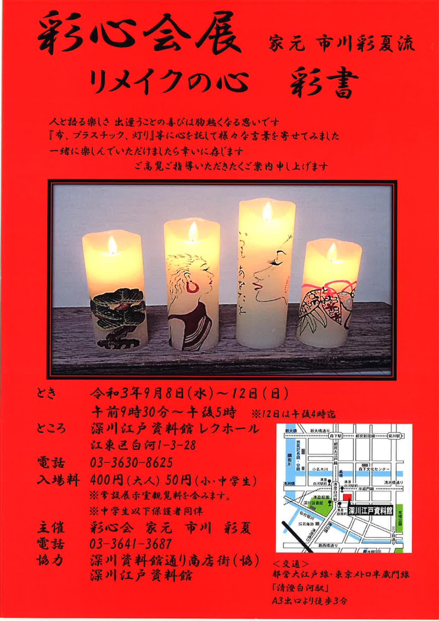 財団ホーム深川江戸資料館イベント・講座情報「彩心会展 リメイクの心 彩書 家元 市川彩夏流」