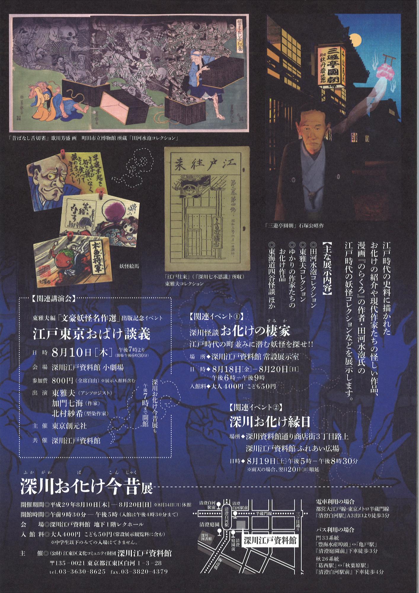 | 主な展示内容 | ◎田河水泡コレクション ◎東雅夫コレクション ◎ゆかりの作家たちのお化け作品など 北葛飾狸狐(深川怪談)「深川七不思議」 氷厘亭氷泉(イラストレーター)、しげおか秀満(漫画家)、東雲騎人(妖怪絵師)「妖怪絵馬」 アマヤギ堂(絵師)「ときめく妖怪図鑑」イラスト 北村紗希(型染作家)「文豪妖怪名作選」挿画 天野行雄(日本物怪観光)「明治の妖怪」 石塚公昭(人形作家)「三遊亭円朝」 ◎東海道四谷怪談の世界 ◎深川の怪異 ほか |