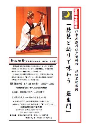| 「琵琶と語りで味わう 羅生門」 | 8月26日(土) 19:00~ 出演:村山旭勢 場所:火の見櫓前 |