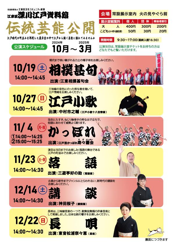 | 注意事項 | *定員を超える場合は、入場制限いたします。 *諸事情により開催中止となる場合や、日時、出演者が変更となる場合があります。 最新情報は深川江戸資料館ホームページをご覧いただくか、お電話でお問い合わせください。 |