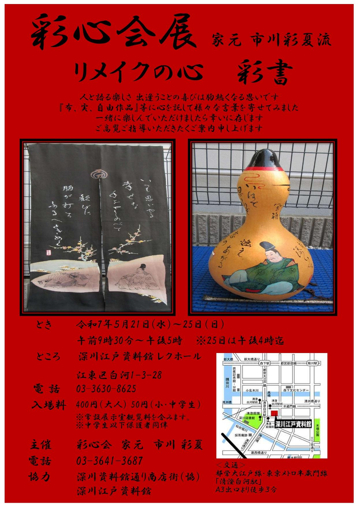 財団ホーム深川江戸資料館イベント・講座情報「彩心会展 リメイクの心 彩書 家元 市川彩夏流」
