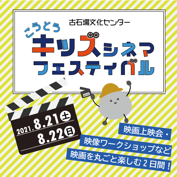 | 夏休みこども映画教室 制作作品発表会 | 2021年度「夏休みこども映画教室」で制作したオリジナル映画と過去2年間の作品を上映します。上映後、修了証の授与式を行います。 ■上映作品 2019年度制作「きもだめし~ふるいしくんVS死神」 2020年度制作「ふるいしくんと新型コロナウイルスバスターズ」 2021年度制作「(タイトル未定)」+メイキング映像 〈日 時〉8/21(土)11:00開演(12:00終了) 〈入場料〉無料 ※どなたでもご覧いただけます。 ※お席に限りがあるため、入場をお断りする場合があります。 |