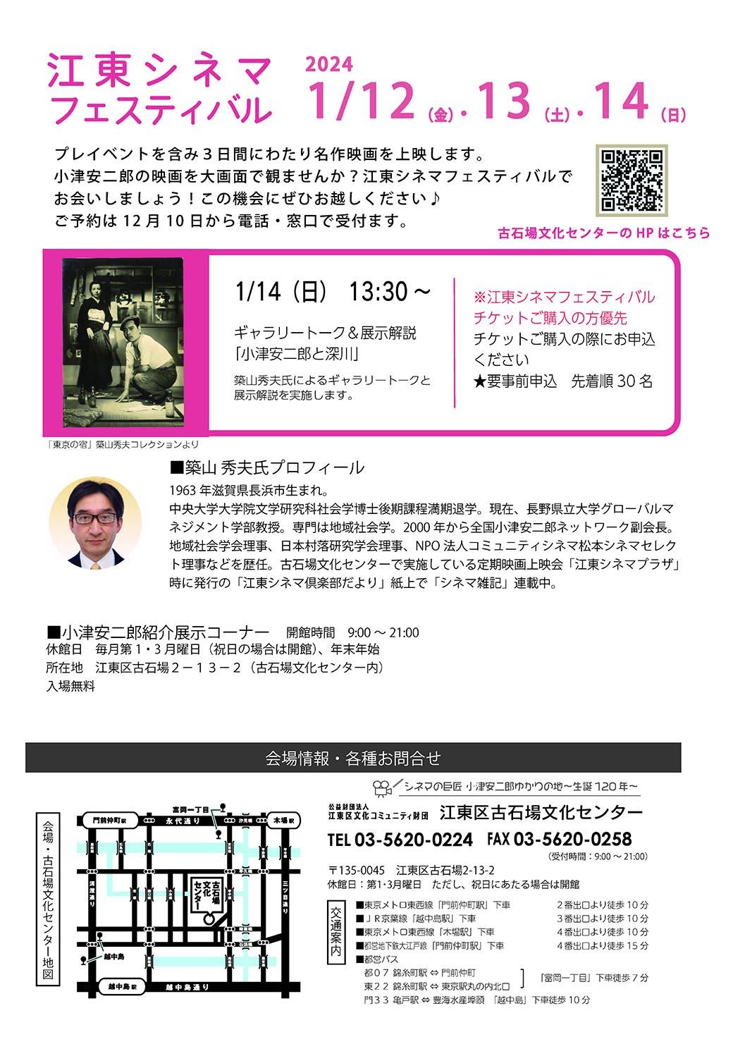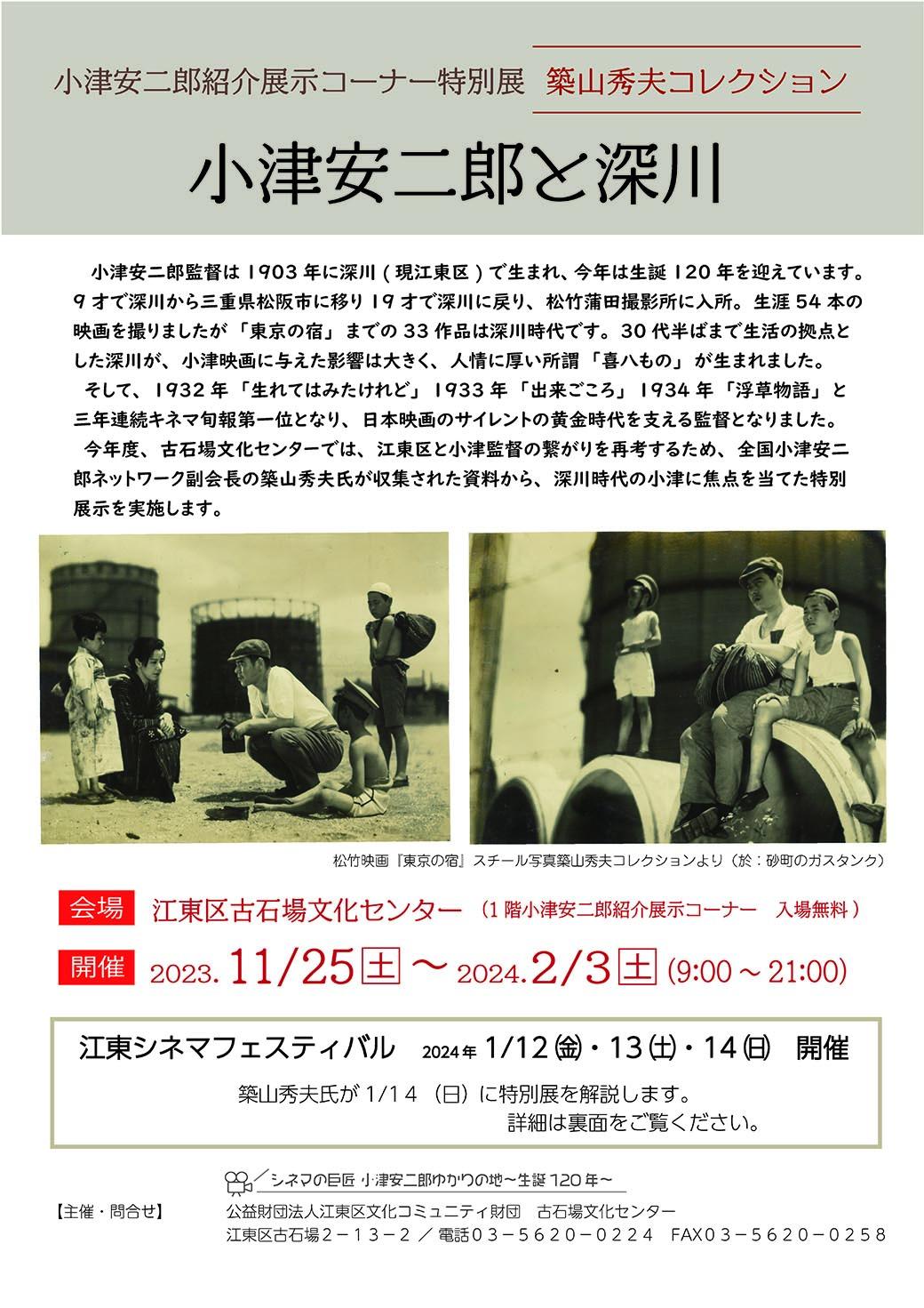 今年は、江東区と小津監督の繋がりを再考するために、深川時代の小津に焦点を当てた展示会を実施いたします。
