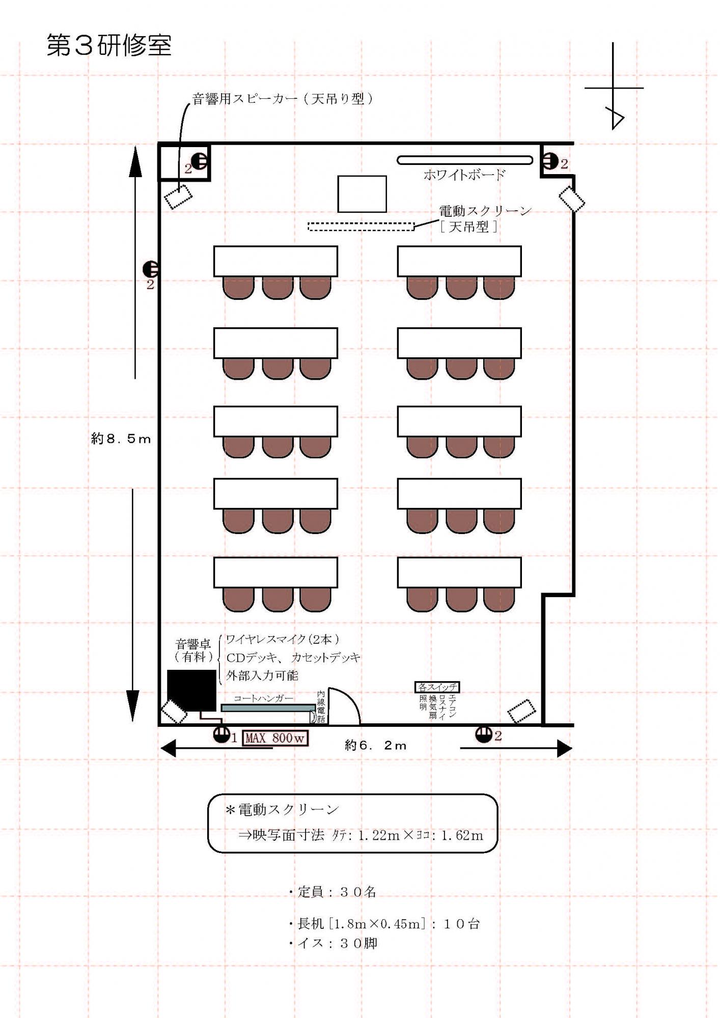 | 備付備品 | ホワイトボード1台 ハンガーラック1台 傘立1台 案内板1台 スクリーン 音響卓(有料) 電子ピアノ(有料) |