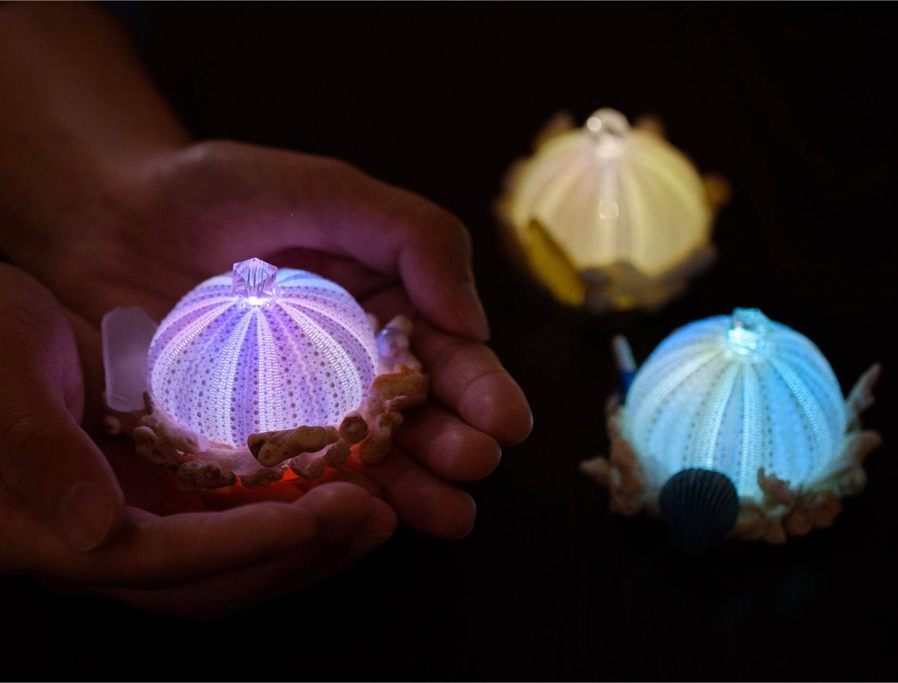 | ウニランプ・オーシャンボールランプ作り | ウニの殻とサンゴでおしゃれなランプをつくろう。 7月26日(日)①10時②11時30分③13時30分④15時 定員・対象:各回10名(小3以下は保護者同伴) 材料費:1000円~※種類や大きさによって異なります。 |