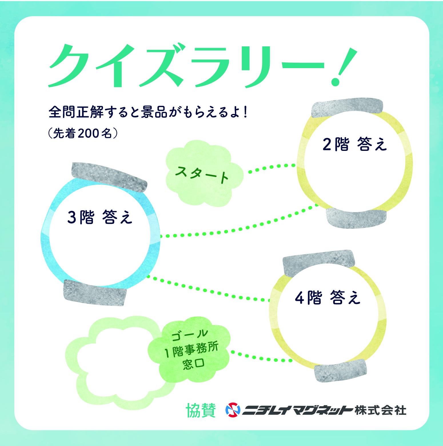 | クイズラリー | 【時間】10時00分~15時00分 【会場】1階 事務所(ゴール) ※先着150名に景品あり |