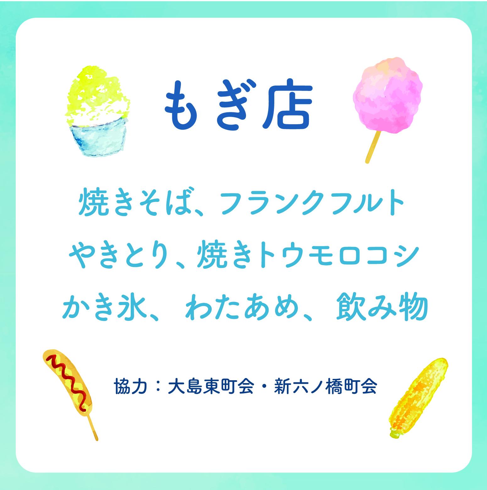 | もぎ店 | 【時間】10時00分~15時00分 ※商品がなくなり次第終了 【会場】駐車場・1階ロビー 【予定メニュー】焼きそば、やきとり、フランクフルト、焼きトウモロコシ、かき氷、わたあめ、飲み物 【協力】大島東町会・新六ノ橋町会 |