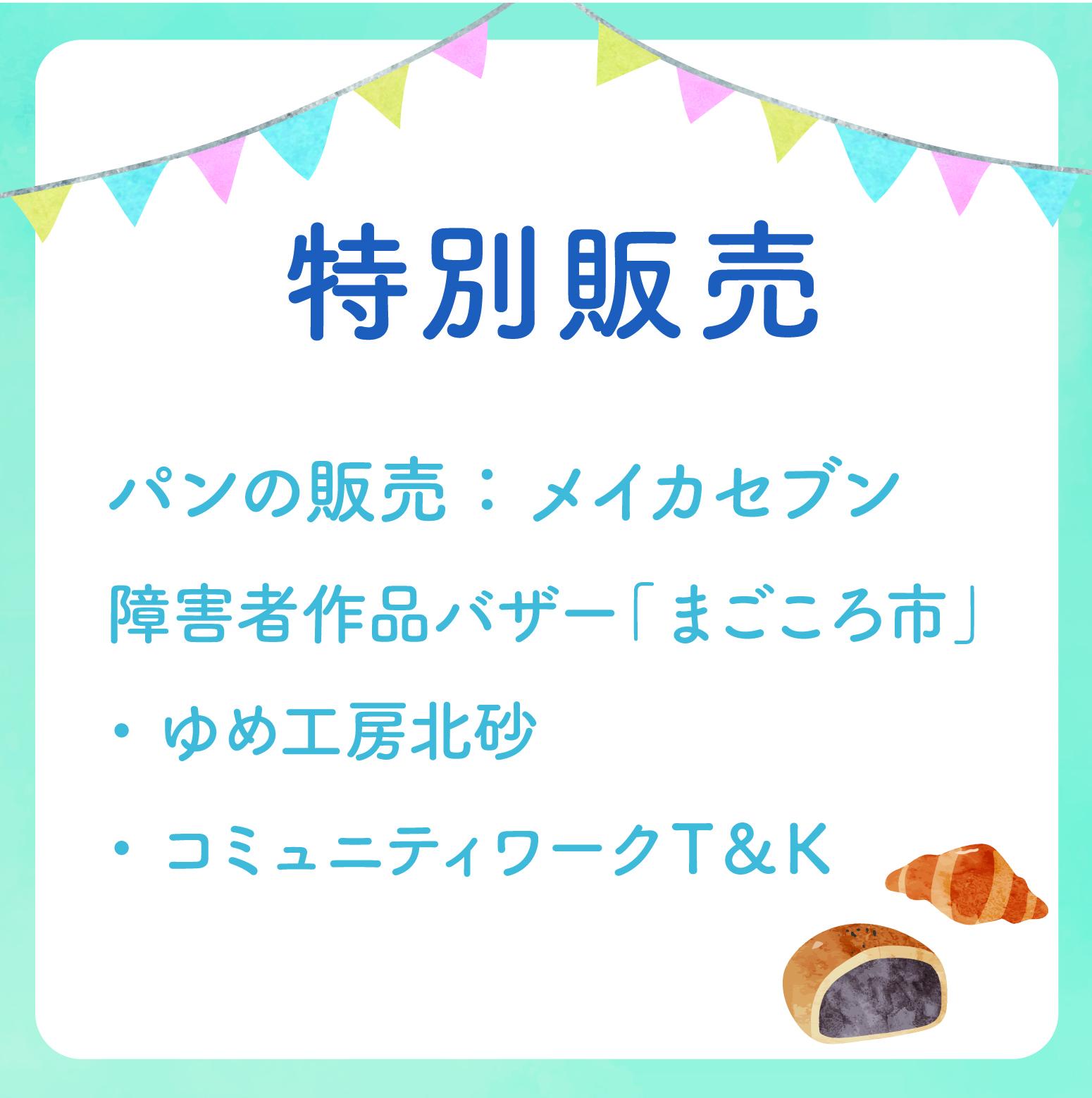 | 特別販売 | 【時間】10時00分~15時00分 ※商品がなくなり次第終了 【会場】1階 ロビー 【協力】メイカセブン(パンの販売)/障害者作品バザー「まごころ市」:ゆめ工房北砂・コミュニティワークT&K |