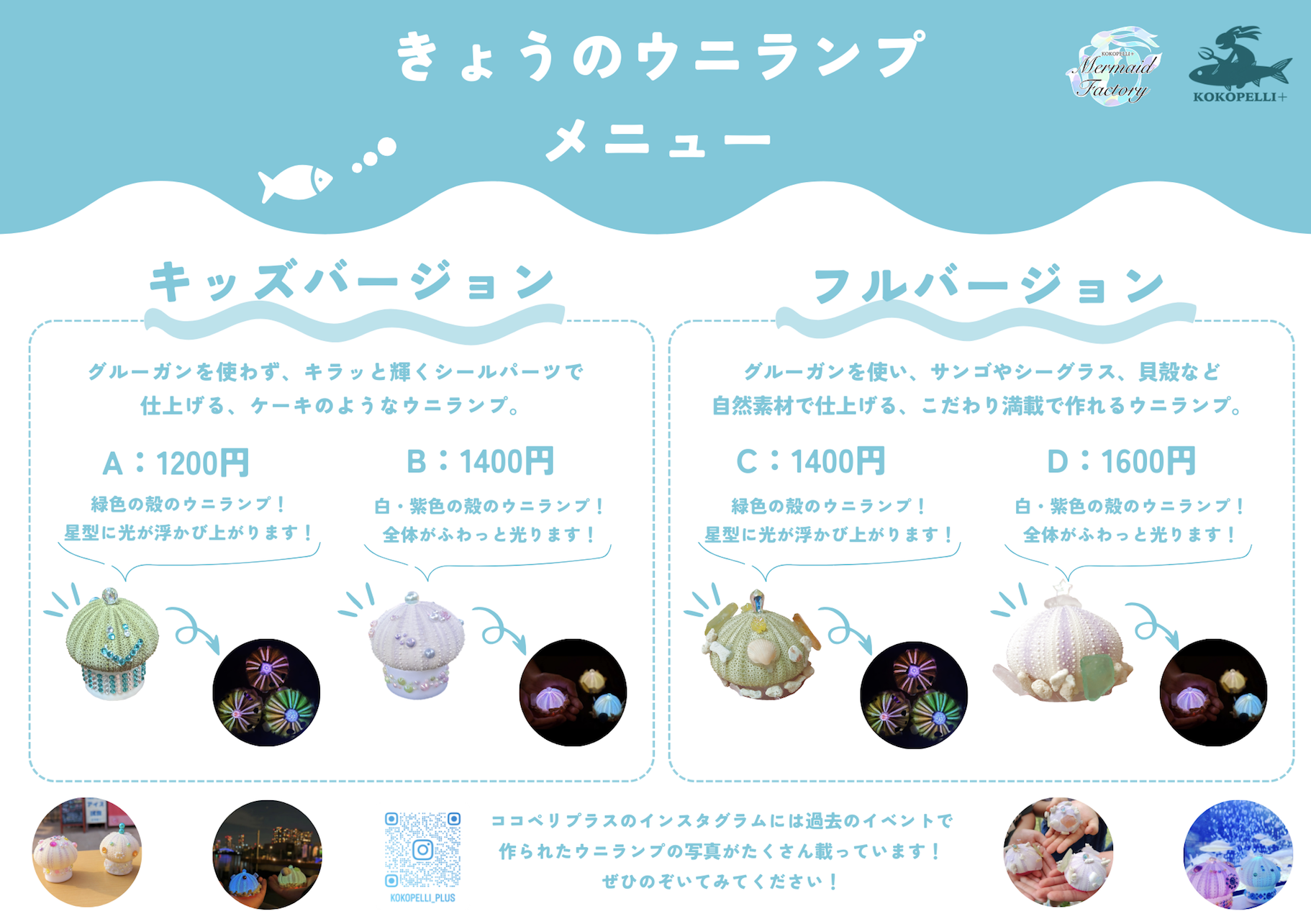 ◆フルバージョン:グルーガンを使い、サンゴやシーグラス、貝殻などの自然素材で仕上げる、こだわり満載で作れるウニランプ。
