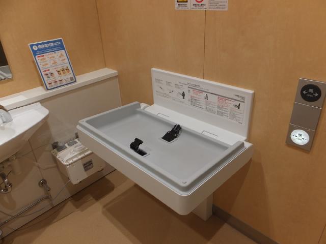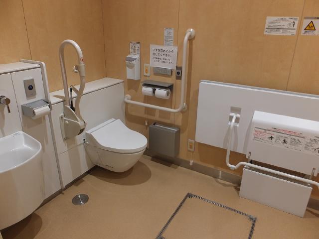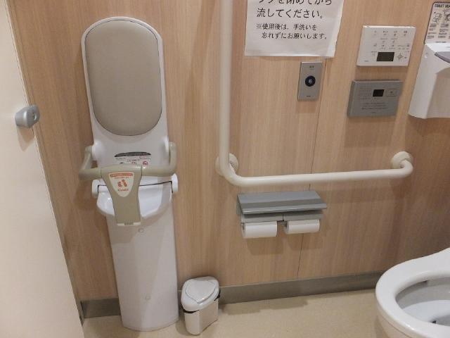 1階のバリアフリートイレはオストメイト用設備やお子様から身体の不自由な方(体重100Kg)まで、ご利用いただけるベンチシートも設置しています。サニタリーボックスも設置しています。