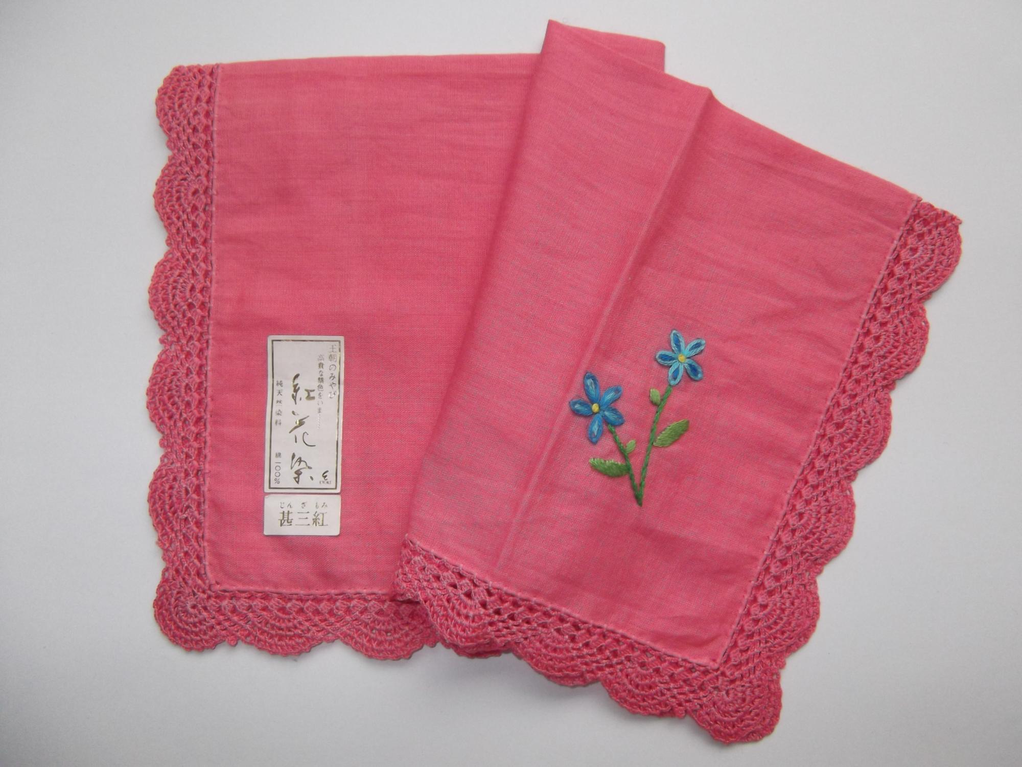 紅花染ハンカチに刺しゅうを