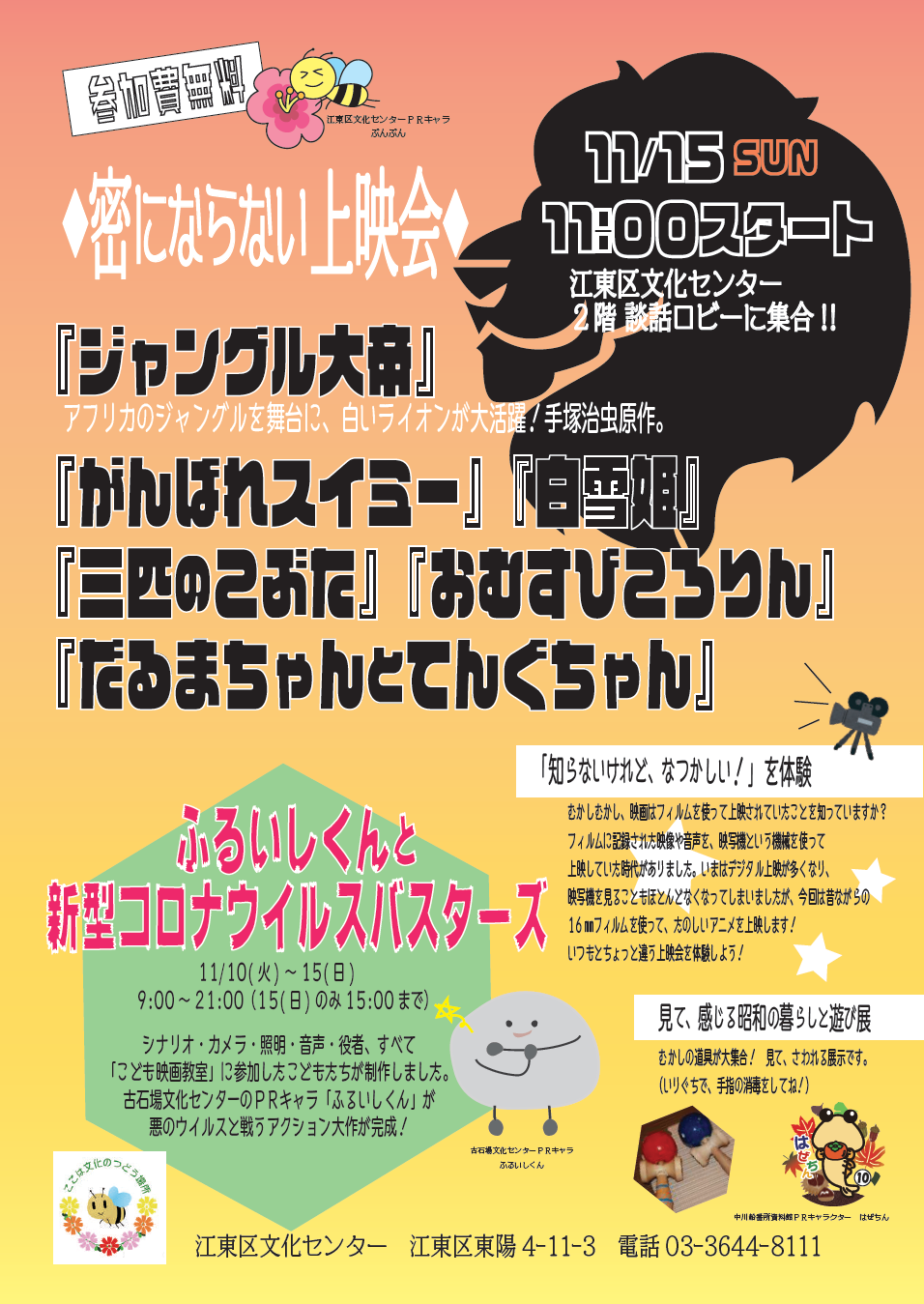 | 16mmフィルム上映会(会場:2階談話ロビー) | ※11月15日のみ 11:00~ アニメ6作品を上映します |