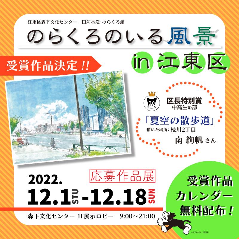 | 受賞作品カレンダー配布! | 受賞作品12点をおさめた2023年の卓上カレンダーをプレゼント! 表紙は審査員・山根青鬼先生による描きおろしです。 絵の部分は切り離してポストカードとしてお使いいただけます。 【配布日】2022年12月1日(木)~先着順 【配布場所】 江東区内各文化センター、総合区民センター、ティアラこうとう、深川江戸資料館、芭蕉記念館、中川船番所資料館 窓口にてお一人様1部無料配布! ※各館100部ずつ配布、無くなり次第配付終了となります。 |