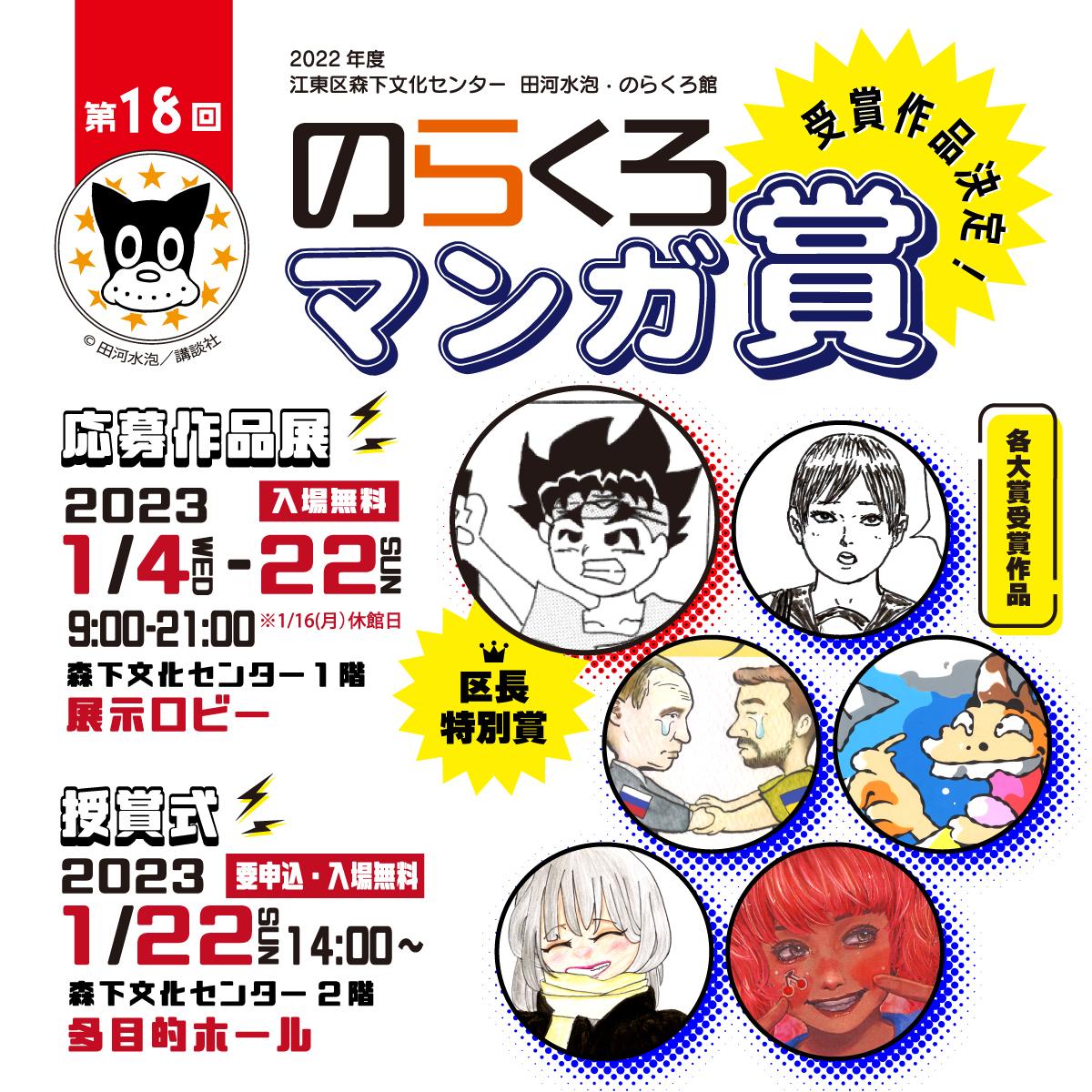 【内容】  各賞の授与のほか、審査員による講評も行います。当日はのらくろもお祝いにかけつけます。
