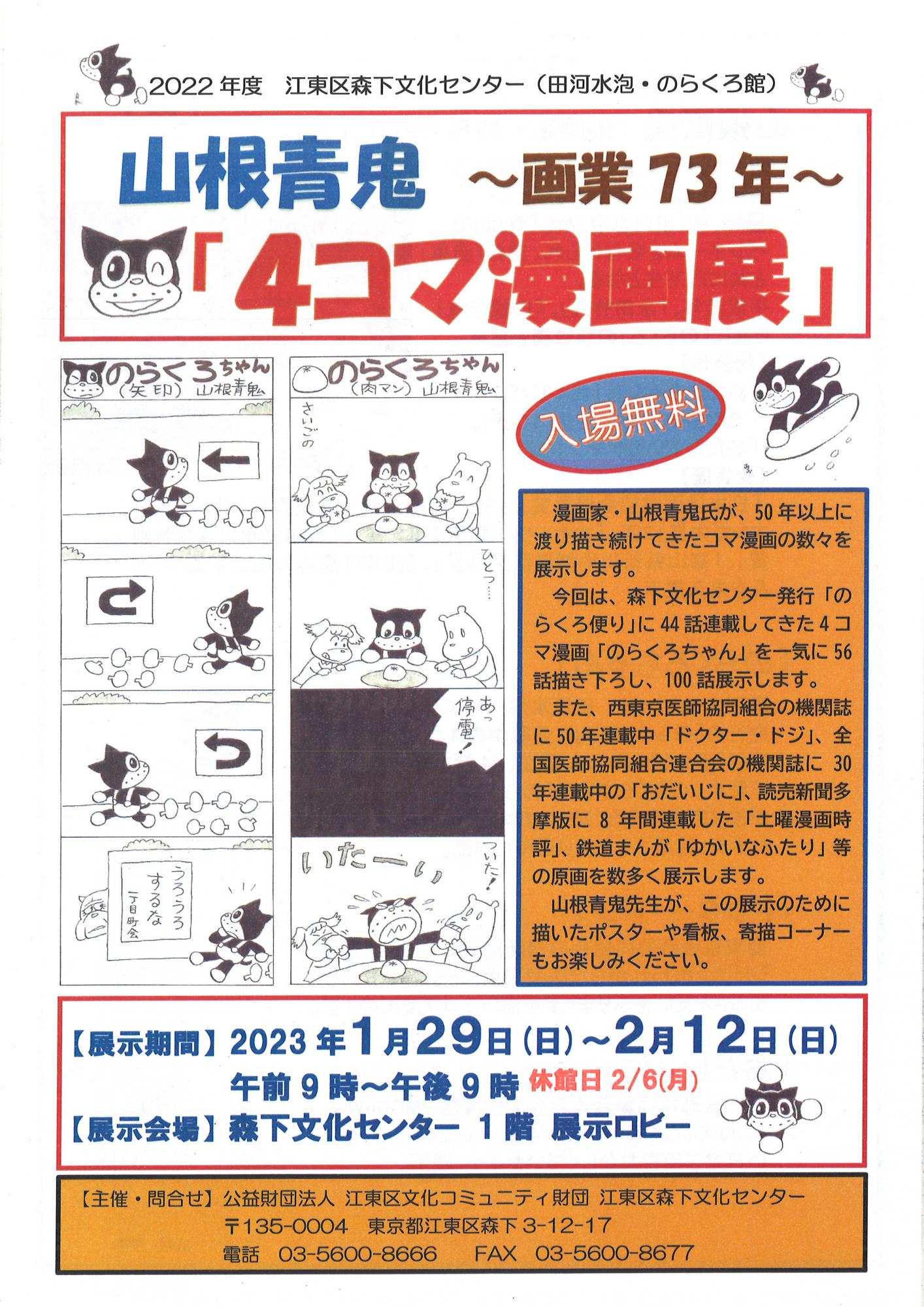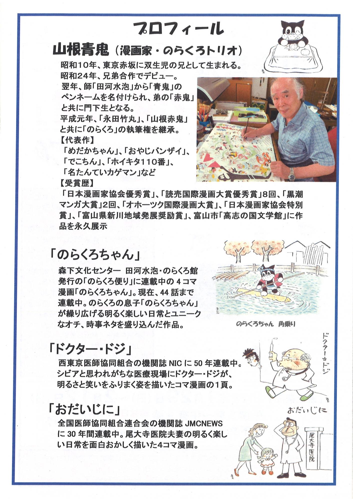 漫画家・山根青鬼氏が、50年以上に渡り描き続けてきたコマ漫画の数々を展示します。