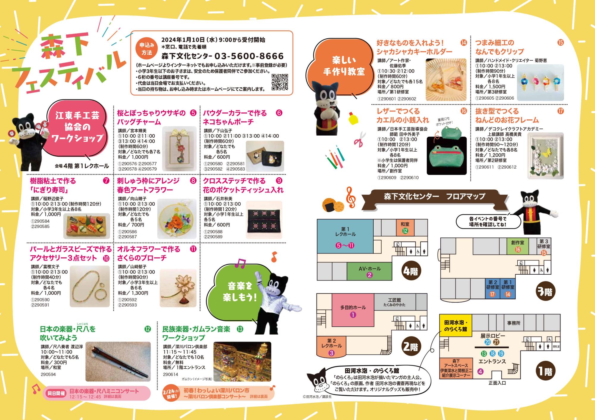 抜き型でつくる ねんどのお花フレーム| 江東手工芸協会のワークショップ 会場:4階 第1レクホール | ★【5】桜とぽっちゃりウサギのバックチャーム (1)10:00~ (2)11:00~ (3)13:00~ (4)14:00~ 対象:どなたでも 各回7名 料金:1,000円 講師:宮本輝美 ネット申込番号(講座番号) (1)290576 (2)290577 (3)290578 (4)290579 ★【6】パウダーカラーで作るネコちゃんポーチ (1)10:00~ (2)11:00~ (3)13:00~ (4)14:00~ 対象:どなたでも 各回5名 料金:700円 講師:下山弘子 ネット申込番号(講座番号) (1)290580 (2)290581 (3)290582 (4)290583 ★【7】樹脂粘土で作る「にぎり寿司」 (1)10:00~ (2)13:00~ 対象:小学3年生以上 各回8名 料金:1,000円 講師:稲野辺俊子 ネット申込番号(講座番号) (1)290584 (2)290585 ★【8】刺しゅう枠にアレンジ 春色アートフラワー (1)10:00~ (2)13:00~ 対象:どなたでも 各回5名 料金:700円 講師:向山晴子 ネット申込番号(講座番号) (1)290586 (2)290587 ★【9】クロスステッチで作る花のポケットティッシュ入れ (1)10:00~ (2)13:00~ 対象:小学1年生以上 各回5名 料金:600円 講師:石井秋美 ネット申込番号(講座番号) (1)290588 (2)290589 ★【10】パールとガラスビーズで作るアクセサリー3点セット (1)10:00~ (2)13:00~ 対象:どなたでも 各回4名 料金:1,000円 講師:富樫文子 ネット申込番号(講座番号) (1)290590 (2)290591 ★【11】オルネフラワーで作る さくらのブローチ (1)10:00~ (2)13:00~ 対象:小学3年生以上 各回6名 料金:1,300円 講師:山崎郁子 ネット申込番号(講座番号) (1)290592 (2)290593 |