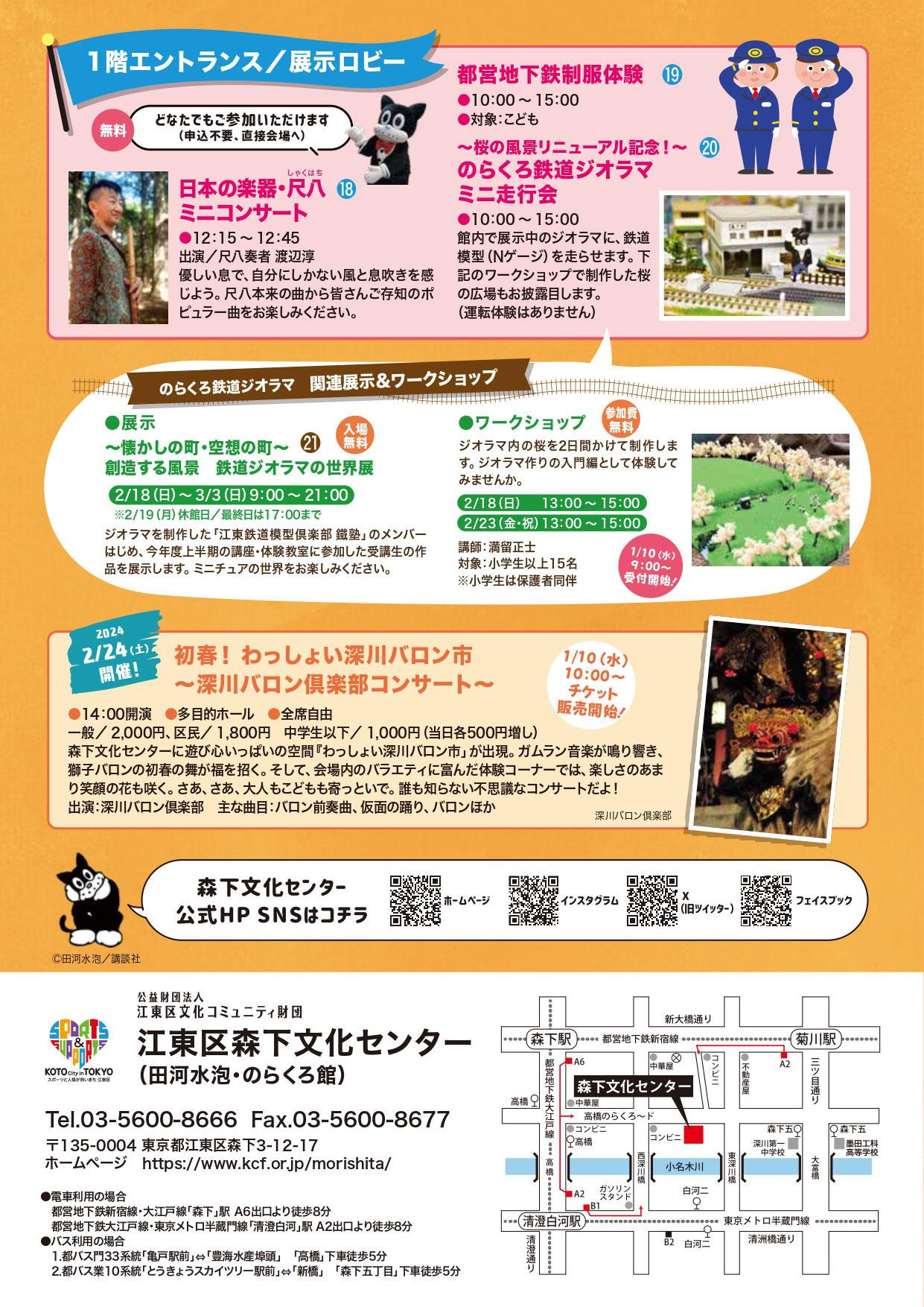 | 1階エントランス/展示ロビー (申込不要、直接会場へ) | ★【18】日本の楽器・尺八(しゃくはち)ミニコンサート 12:15~12:45 出演:尺八奏者 渡辺淳 料金:無料 ★【19】都営地下鉄制服体験(こども対象) 10:00~15:00 協力:東京都交通局 料金:無料 ★【20】~桜の風景リニューアル記念!~のらくろ鉄道ジオラマミニ走行会 10:00~15:00 協力:江東鉄道模型倶楽部 鐵塾 料金:無料 ※運転体験はありません ★【4】まごころ市(障害者作品バザー) 10:00~15:00 協力:江東区社会福祉協議会 |