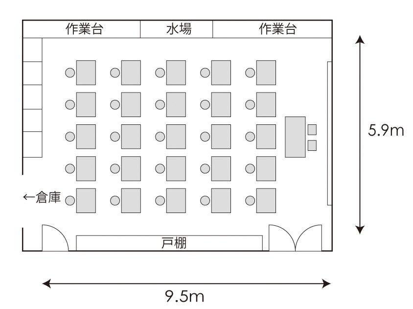 | 備付備品 | 江戸切子研磨機15台(有料) ホワイトボード(壁面備付)1台 黒板1台 ハンガーラック1台 傘立て1台 案内板1台 長机1台 水道設備 |