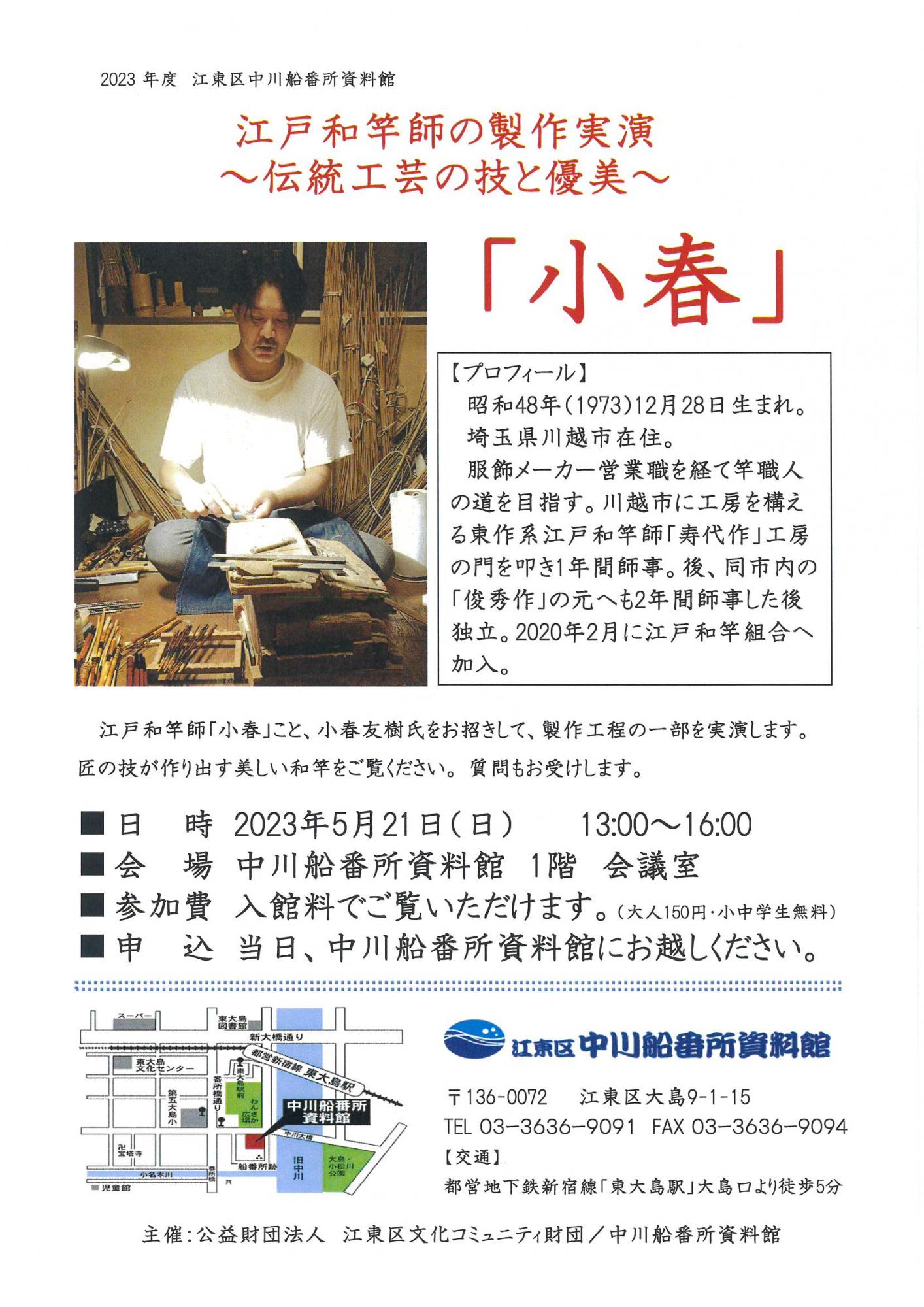 | 《小春氏 プロフィール》 | 昭和48年(1973)12月28日生まれ。埼玉県川越市在住。 服飾メーカー営業職を経て、竿職人の道を目指す。川越市に工房を構える東作系江戸和竿師「寿代作」工房の門を叩き、1年間師事。その後、同市内の「俊秀作」の元へも2年間師事した後、独立。2020年2月に江戸和竿組合へ加入。 |