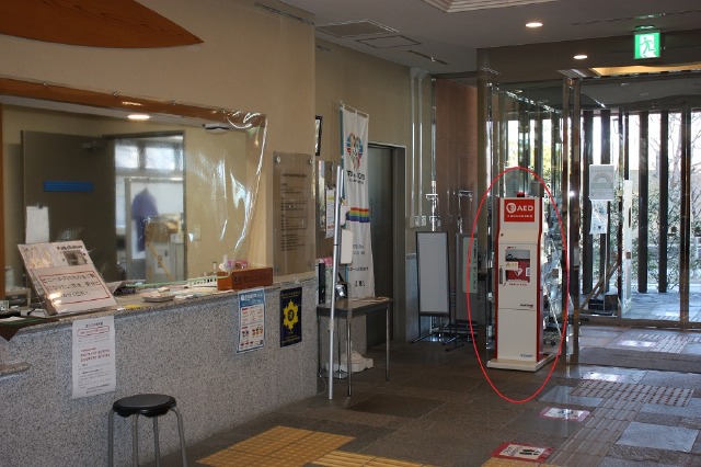 AEDは1階エントランス、受付右手にあります。