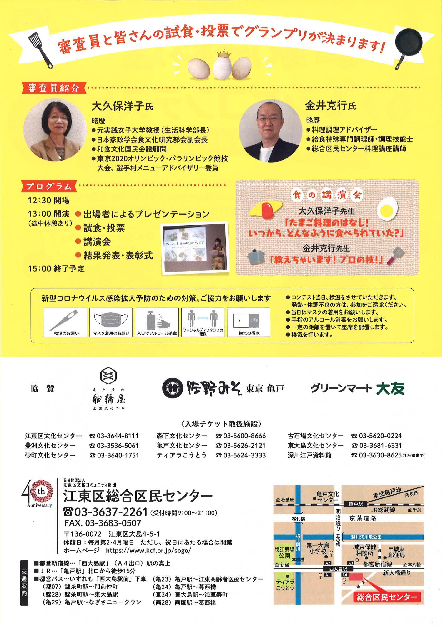 さらに、来場者の皆さまにも、試食して投票していただきます!講演会では大久保洋子氏による「たまご料理のはなし!いつから、どんなふうに食べられていた?」や金井克行氏による「教えちゃいます!プロの技!」についてお話しいただきます。手作りのおかずをお楽しみいただきながら、グランプリ・各賞の行方と講演会をご堪能ください!!