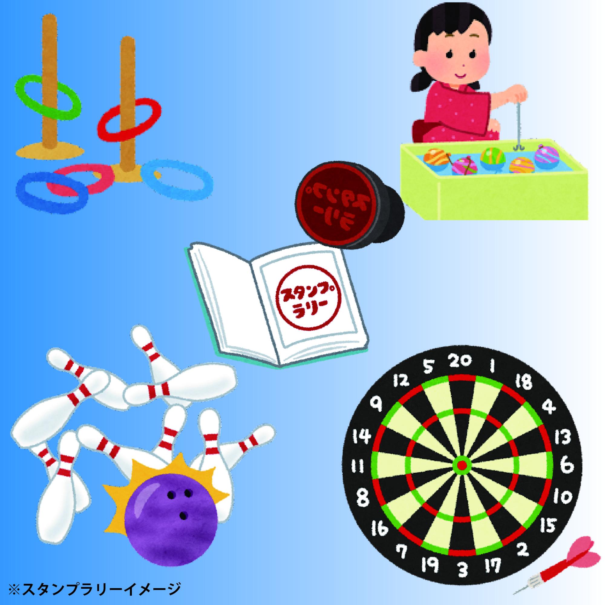 | スタンプラリー | ヨーヨー釣り、ダーツ、輪投げ、ボウリングにチャレンジ! 2階・5階・6階・7階のゲームに参加して、3つスタンプを集めて 2階の事務所で景品をもらおう! 時間:10時~15時30分 費用:無料 団体:江東区リクリエーション協会 ※当日直接お越しください。 |