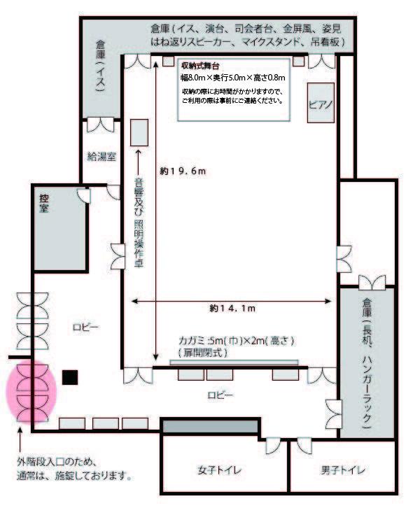 | 備付備品 | ホワイトボード2台 ハンガーラック2台 傘立て2台 案内板2台 掲示板4台 グランドピアノ(有料) 舞台(有料) 音響設備(有料) 移動式舞台1台(有料) ワイヤレスマイク/スピーチ用(有料) ワイヤレスマイク/ボーカル用2本(有料) はね返りスピーカー2台 (有料) 照明操作盤 (有料) ミラーボール (有料) 演台 (有料) 司会者台 (有料) プロジェクター(大)(有料) カラオケシステム (有料) 金屏風 (有料) |