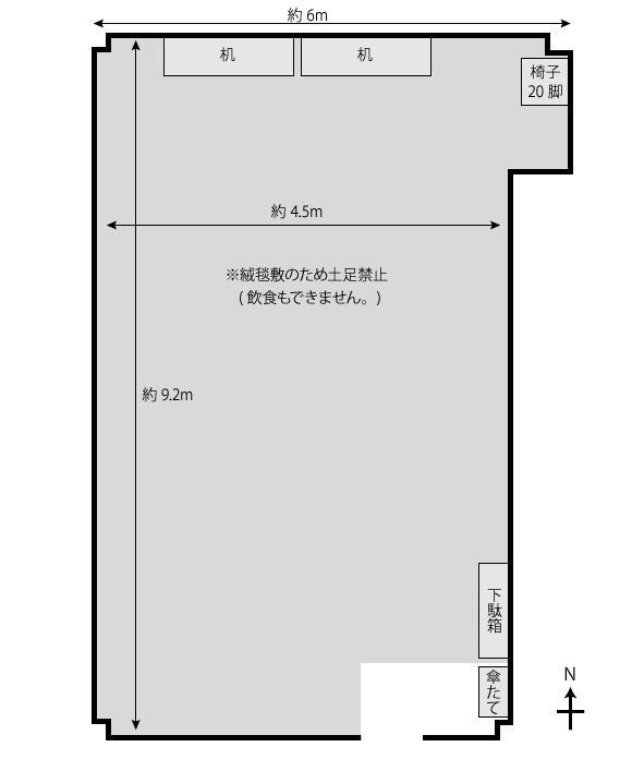 | 主な利用目的 | 総会、会議・研修、説明会、面接、学習会、邦楽、歌・合唱(カラオケ除く)、楽団パート練習(弦楽器)、演劇練習、ヨガ・健康体操、気功・太極拳、囲碁・将棋、写真、着付け、フラワーアレンジメント、和裁、交流会(飲食なし) |