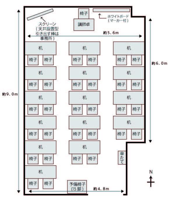 | 備付備品 | スクリーン(天井設置型) ホワイトボード1台 講師卓 傘立て1台 |