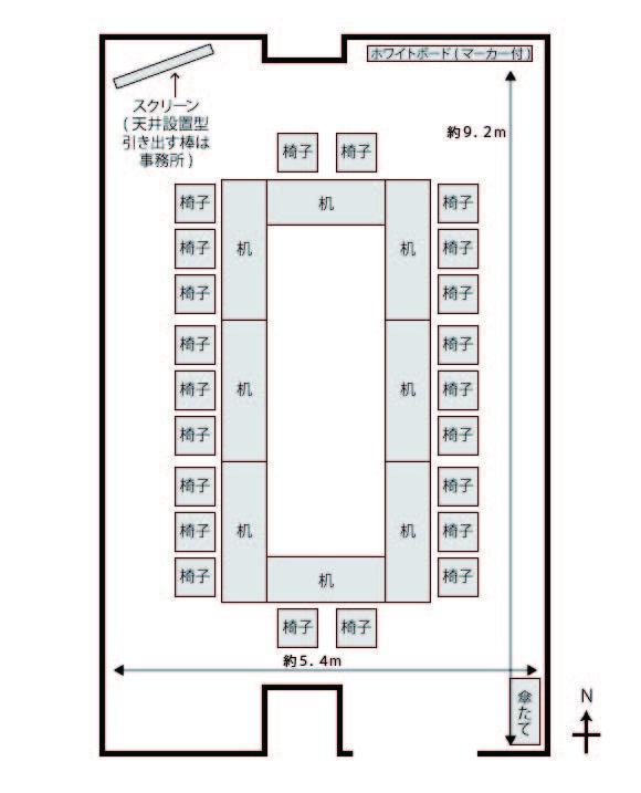 | 備付備品 | スクリーン(天井設置型) ホワイトボード1台 傘立て1台 |