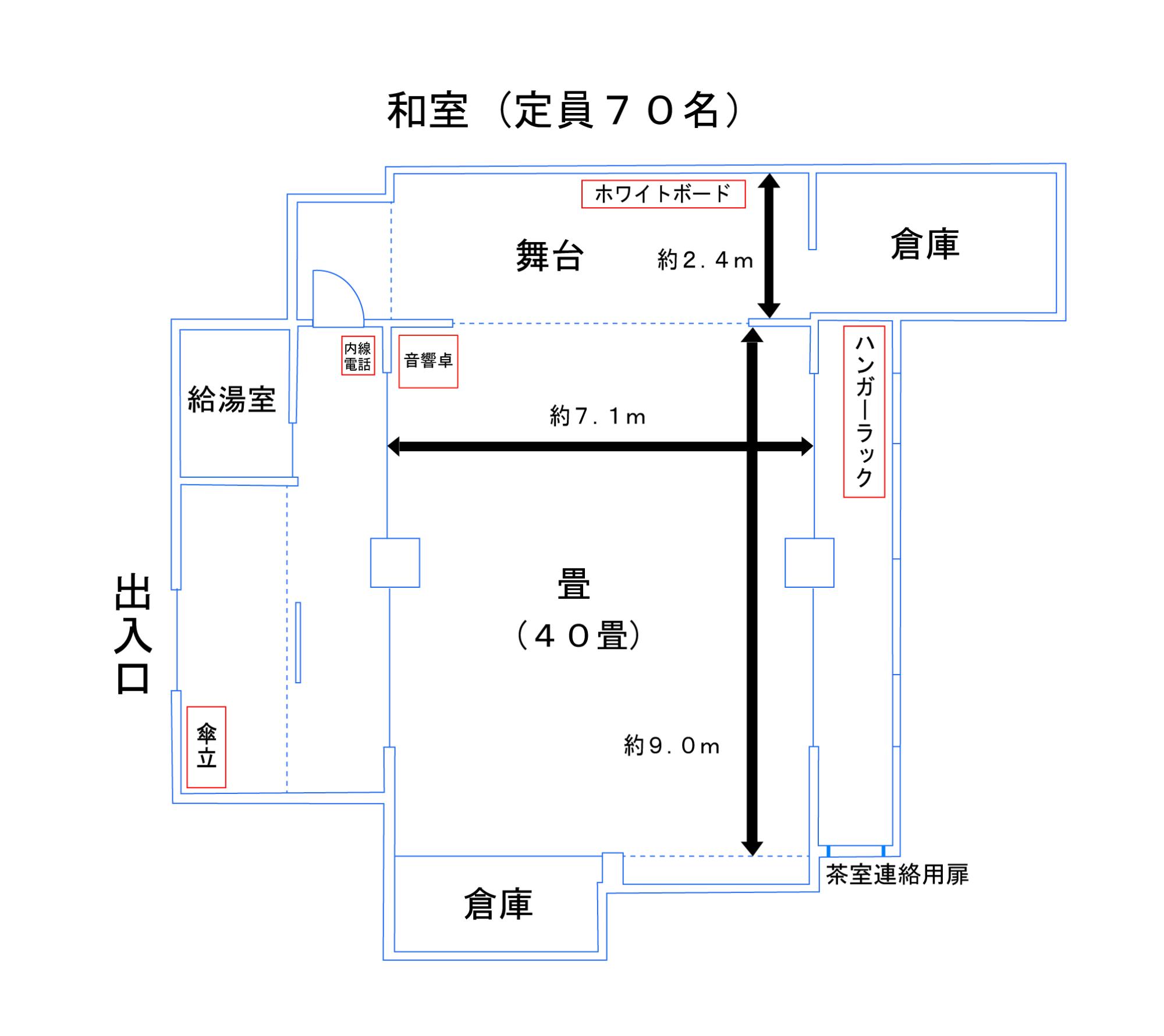 | 備付備品 | 立身鏡1台 ホワイトボード1台 傘立1台 ハンガーラック1台 座布団 音響卓セット(別料金) |