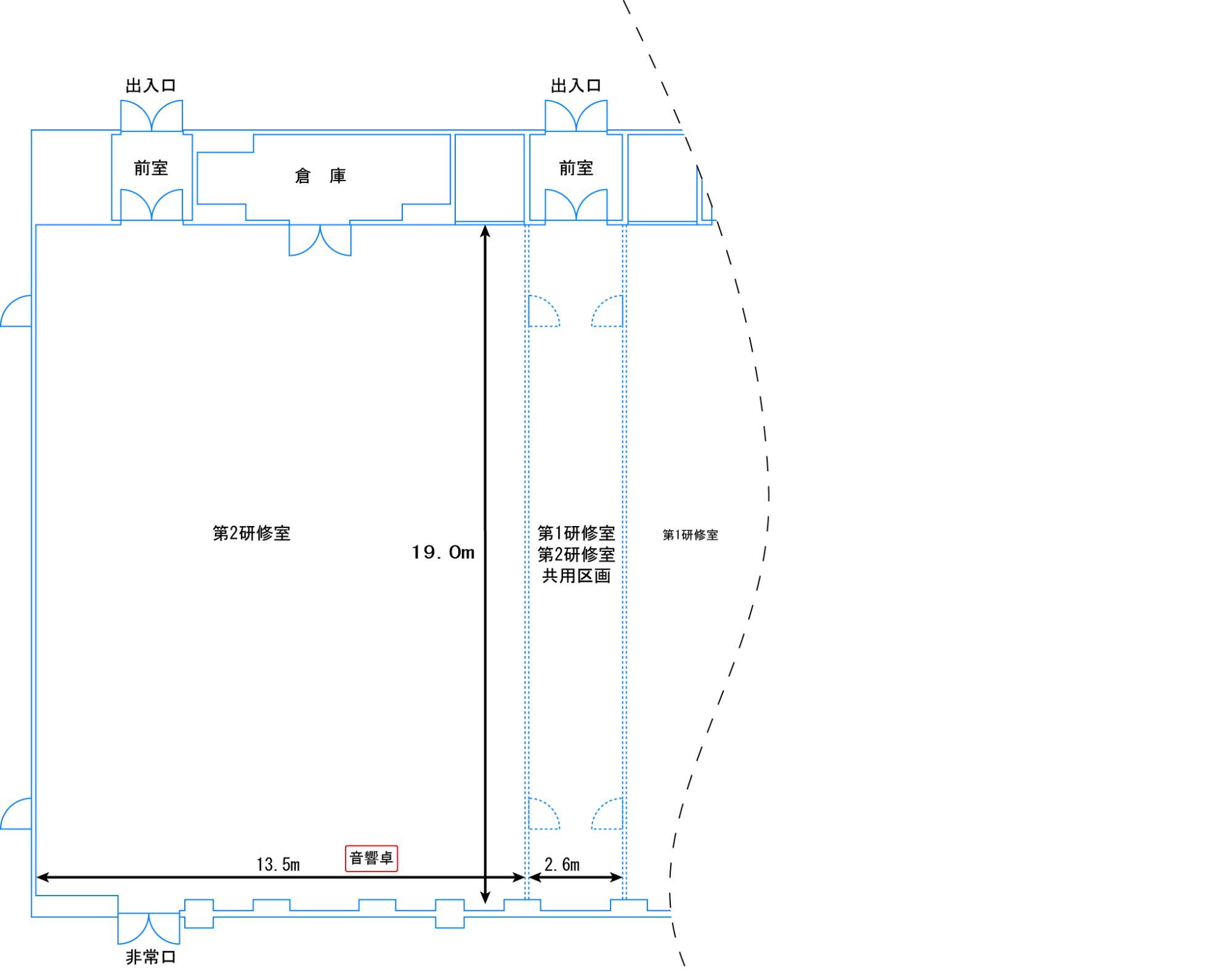| その他 | 第1・2研修室を連結する場合、パーテーションの開閉は目安として約20~30分程かかります。 パーテーションの開閉は、利用者の方にお願いします。 パーテーション開閉および準備後片付等はご利用時間内にお願いします。 面積表記は、室内の倉庫、柱等も含むため、下部レイアウト図とは合致しない場合があります。 |