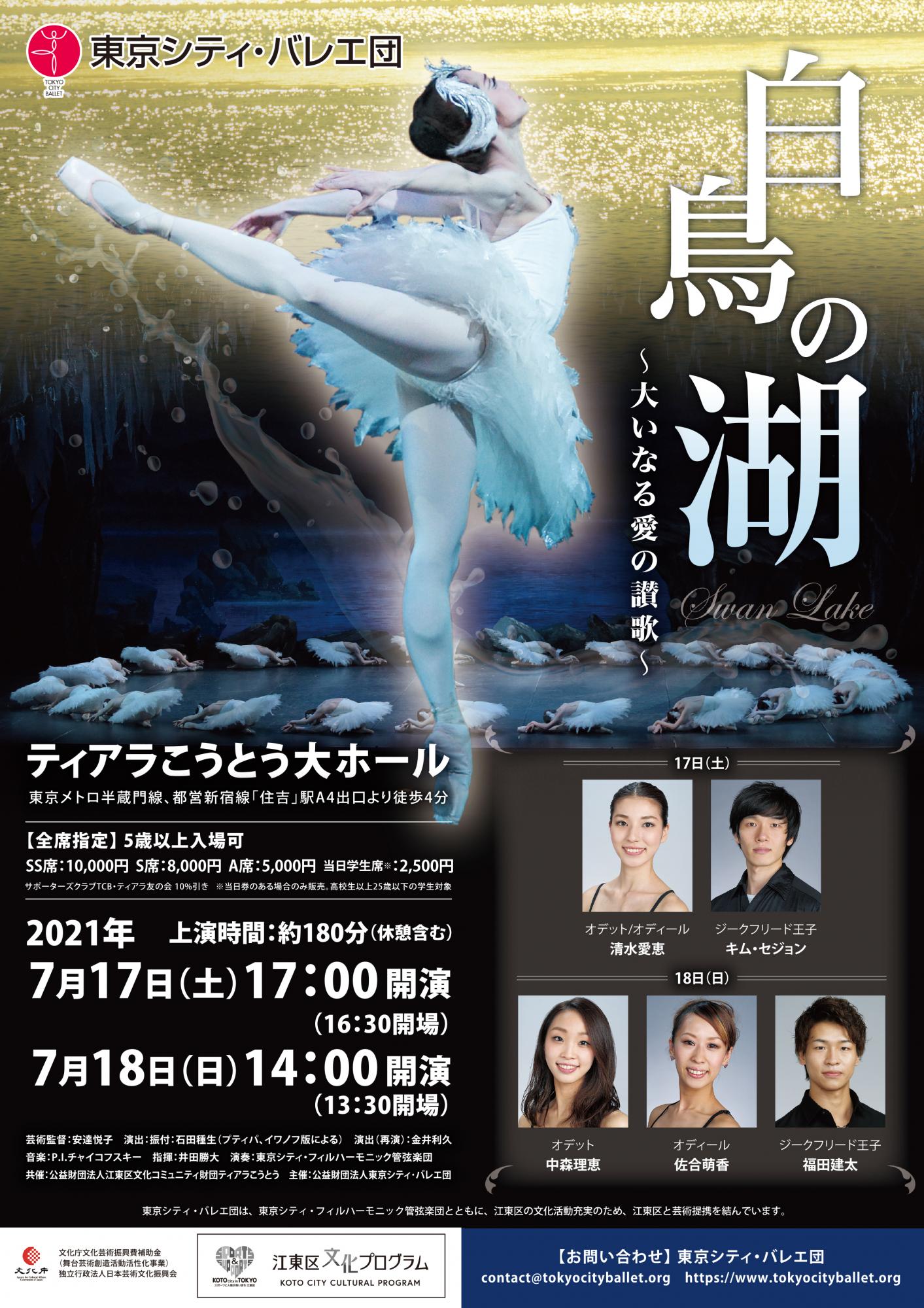 | 主な出演(予定) | 【17日公演】 オデット/オディール 清水愛恵 ジークフリード王子 キム・セジョン ロートバルト 石黒善大 【18日公演】 オデット 中森理恵 オディール 佐合萌香 ジークフリード王子 福田建太 ロートバルト 内村和真 ほか東京シティ・バレエ団 ※出演者は変更となる場合がございます。これに伴う払い戻しはいたしません。 |