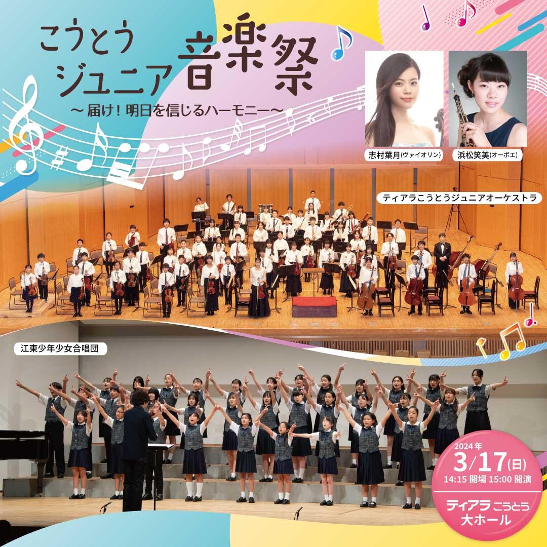 | プログラム | 第一部 ●江東少年少女合唱団 指揮:笹口圭吾 ピアノ:奥田 和 曲目:それじゃ (作詩:木島始 作曲:信長貴富) 逝く夏の歌(作詩:中原中也 作曲:信長貴富) ひかり (作詩:石原一輝 作曲:鈴木美紀) 第二部 ●ティアラこうとうジュニアオーケストラ 指揮:横山奏 曲目:クラウス・バデルト/「パイレーツ・オブ・カリビアン」よりメドレー エンニオ・モリコーネ/「ニューシネマパラダイス」より愛のテーマ(卒団生共演) ジョルジュ・ビゼー/「カルメン組曲」より 第1番、第2番 ●合同演奏 指揮:横山奏 曲目:ジャン・シベリウス/交響詩フィンランディア(合唱編曲:金井美雪) 杉本竜一/ビリーブ |