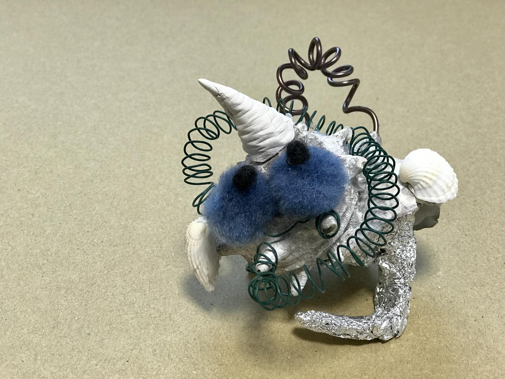 サザエの貝殻に絵の具を塗り、粘土や針金で、花びんや怪獣など好きなものをつくります。