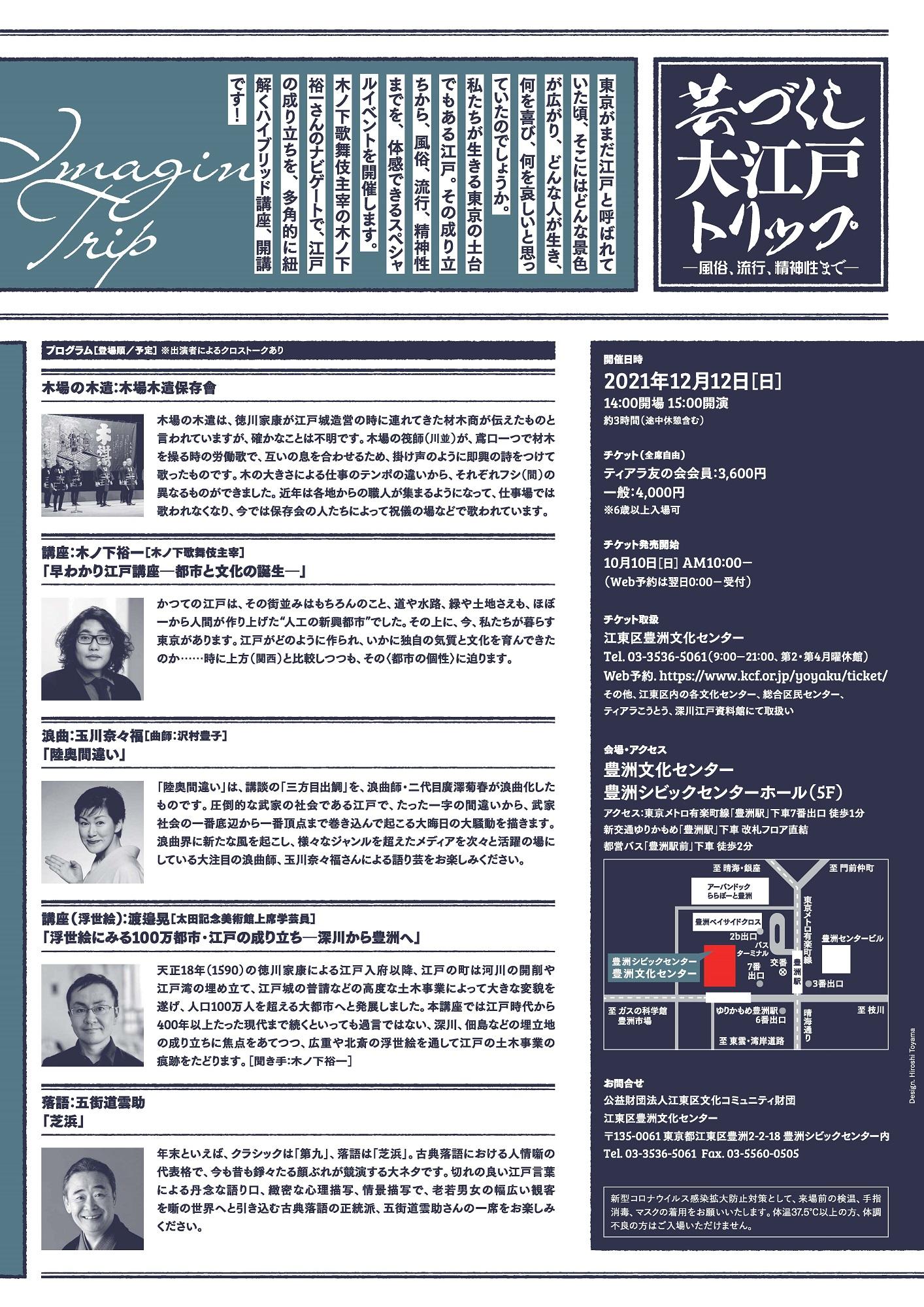 木場の木遣:木場木遣保存會 講座:木ノ下裕一[木ノ下歌舞伎主宰] 「早わかり江戸講座―都市と文化の誕生―」 浪曲:玉川奈々福[曲師:沢村豊子] 「陸奥間違い」 講座(浮世絵):渡邉晃[太田記念美術館上席学芸員] 「浮世絵にみる100万都市・江戸の成り立ち―深川から豊洲へ―」(聞き手:木ノ下裕一) 落語:五街道雲助 「芝浜」 出演者によるクロストーク