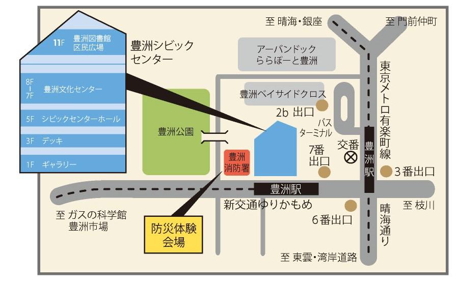 1階、3階、7階レクホール・サブレクホール、8階研修室(2,3,5,6,7研修室)、11階区民広場、11階図書館おはなしのへやキッズ、深川消防署豊洲出張所(別会場)