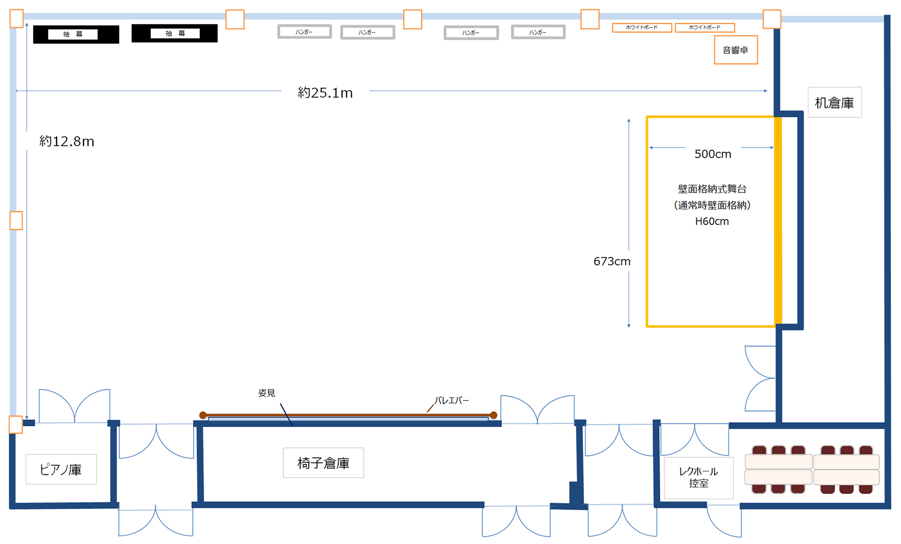 | 備付備品 | 鏡(壁面備付)、ホワイトボード、吊りバトン グランドピアノ、スライド収納式舞台、音響設備/マイク2本付、プロジェクター(有料) |