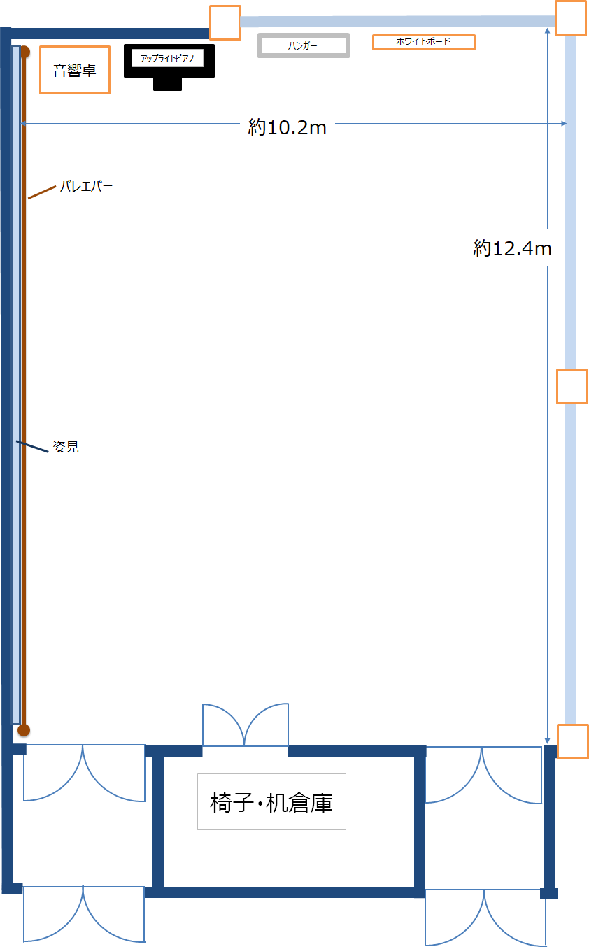 | 備付備品 | 鏡(壁面備付)、ホワイトボード、吊りバトン、バレエバー アップライトピアノ、音響卓セット/マイク2本付、プロジェクター(有料) |